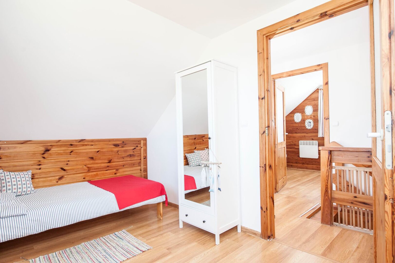 Kameralny domek czteroosobowy z sypialnią, salonem z aneksem kuchennym, łazienką i zadaszonym tarasem. Wyposażenie: TV, lodówka, płyta elektryczna, czajnik, ekspres do kawy, naczynia, pościel i ręczniki. Wydzielony teren wokół budynku. Możliwość